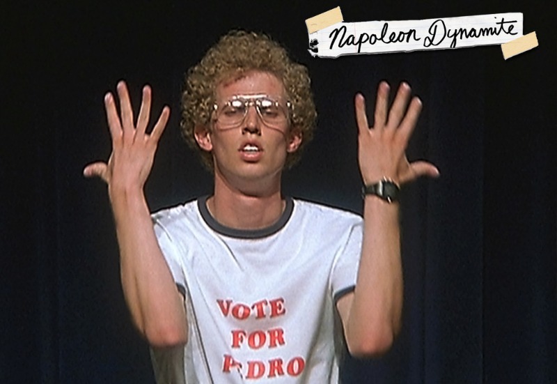 Napoleon Dynamite (2004). Napoleon Dynamite är en töntig 16åring som bor tillsammans med sin farmor och bror i en liten stad i Idaho. Han tycker själv att han är tuff, har rödblont afro och brillor och tycker om att teckna. Brorsan tillbringar all sin tid på nätet för att hitta brudar, han är ungefär lika cool som Napoleon. Bästa vännen är utbytesstudenten Pedro och de bestämmer att de ska vinna studentpresidentvalet över den populära tjejen Summer....