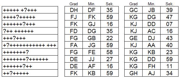 In zehn Aufgaben müssen Sie die Werte von zehn Unbekannten (A, B, C ...) ermitteln. Das Ergebnis ist in jedem Fall eine Ziffer. Wenn Sie die Ziffern in die Tabelle einsetzen, dann erhalten Sie die Koordinaten von zehn deutschen Sehenswürdigkeiten. In den Namen der Sehenswürdigkeiten ist jeweils ein bestimmter Buchstabe gesucht, dessen Position durch das Fragezeichen angegeben ist. Hängen Sie die zehn Buchstaben aneinander. Wenn Sie jetzt jeden Buchstaben durch seinen Vorgänger im Alphabet, durch seinen Nachfolger oder durch sich selbst ersetzen, dann erhalten Sie den Namen einer deutschen Sehenswürdigkeit.