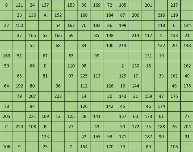 To solve the puzzle place numbers (1-225) in the squares so that the sum of every row, column and main diagonal is the same. I have given you many numbers to start you off. No number is repeated. Place the numbers from the squares with letters in them in the following to find the coordinates to the cache, which is a log only (bring your own writing implement).