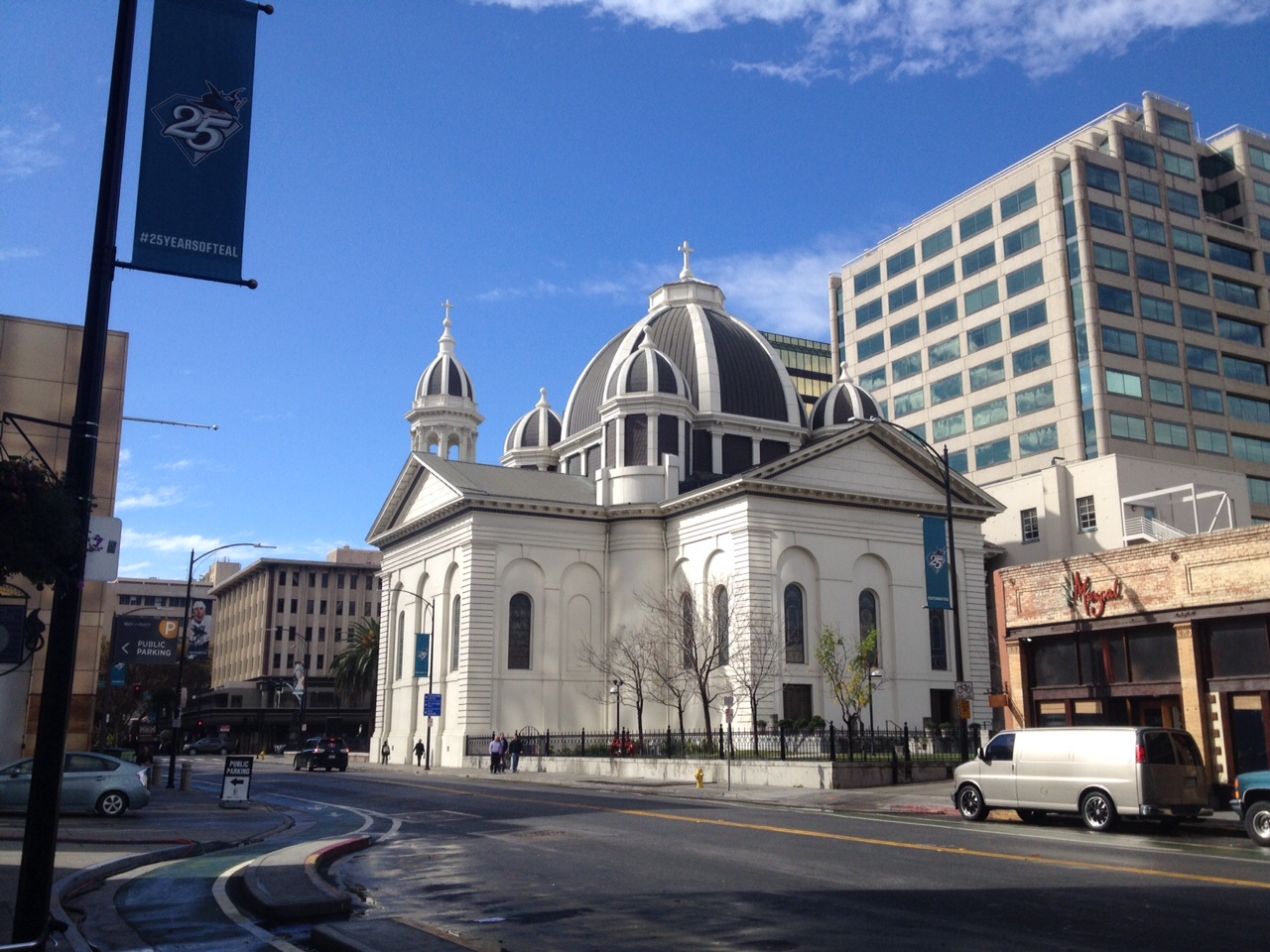 The large dome on the top of the church is the benchmark! I don't think there's an actual benchmark disk up there, though. If you read the description, it clearly describes the "station" as the largest dome surrounded by four smaller domes and surmounted by a cross. The casino dome at the Boardwalk in Santa Cruz is another one like this.