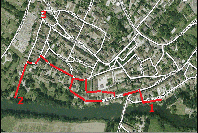 Traverser les trajes, passer sous les remparts, escalier de la roche ou escalier des remparts, hôtel Mairot, château Rouillaud ...etc