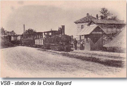 Mis en circulation en décembre 1894, le V.S.B. part de la gare de Voiron, suit la ligne P.L.M. vers le sud, passe sur le pont métallique de Wesseling,arrive sur la commune de Coublevie ,traverse la route nationale, surplombe le futur site d’Antésite (établi 4 ans plus tard) et suit le chemin de la Grande Sure. Un pont en pierre enjambe la route de La Buisse. Un premier arrêt s’effectue à la gare de la Buisse, actuellement lotissement de Champ-Chabert à Coublevie. Le V.S.B. longe la propriété des Dominicains, revient par une grande courbe vers le bois du Roux, suit le cimetière et arrive à la gare de Coublevie, deuxième arrêt. Il poursuit vers la Croix Bayard en passant en dessous de la Chartreuse de Beauregard et du quartier du Mollard. Enfin il arrive à la gare de Croix Bayard, troisième arrêt, dont la « trouée » n’est pas naturelle. Elle a été creusée pour le passage du train. La terre et les cailloux enlevés ont servi de remblaiement des voies. Le train poursuit ensuite en direction de Saint-Etienne de Crossey. Le V.S.B. est exploité durant 44 ans, à raison d’un voyage le matin et d’un autre l’après-midi.