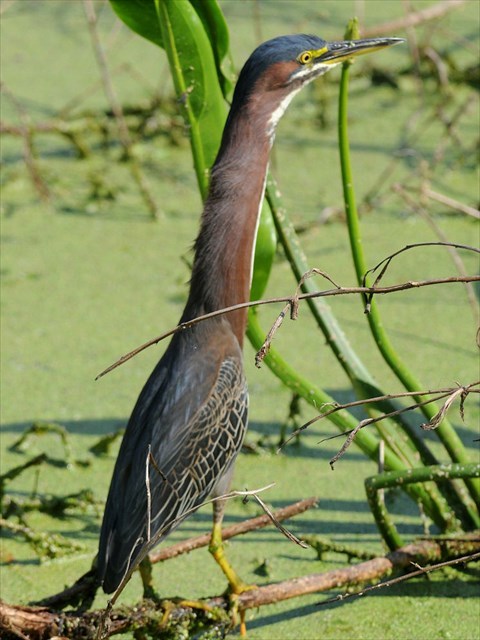 The Green Heron Butorides virescens is a striking bird with a velvet-green back, rich chestnut body, and a dark cap often raised into a short crest. These small herons crouch patiently, at the water’s edge, often hidden behind a tangle of leaves, to surprise fish with a snatch of their daggerlike bill. They sometimes lure in fish using small items such as twigs or insects as bait. As you can see from the photos, they look like totally different species depending on whether their neck is extended or drawn up.