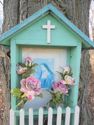 Naši cestu jsme začali u Panny Marie. A u ní i skončíme. Tentokrát u jejího svatého obrázku, který se nachází kousek za místním hřbitovem. Abychom se k němu dostali, je můžete přejít přes celý hřbitov (v pravé horní části naleznete branku), případně lze hřbitov obejít skrze přilehlé parkoviště. A následně je potřeba přejít přes koleje. Dávejte proto na sebe pozor! Na jakém stromě tento obrázek je?