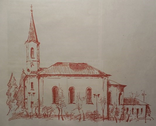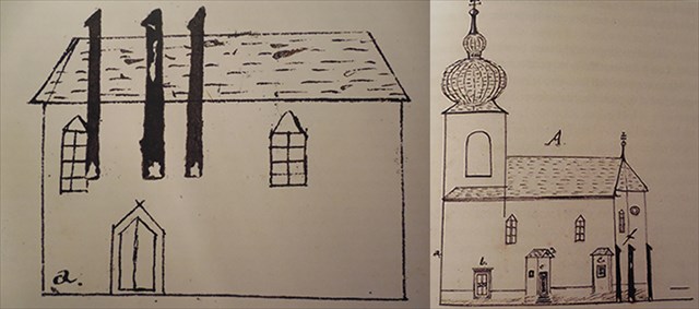 (vlevo údajná podoba modlitebny z roku 1585, vpravo vyobrazení kostela v první polovině 19. století)