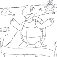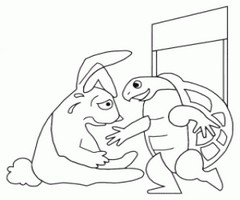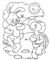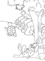 A už to začíná, zajíc děla na startovní čáře přemety, želva si protahuje krk, a oba čekají na startovní zahoukání speciálně pro tuto příležitost probuzené sovy. "Hu huuuu" a vše začalo. Tedy... zajíc vyrazil jako střela a po chvilce zmizel někde v dáli. Želva se rozhlédla, mrkla na zvířátka a zalezla do krunýře. Zvířátka ji pak naložili na trakař a vezli ji co nejkratší cestou k cíli. Mezitím zajíc už pádil kolem řeky a stále se dívá přes rameno, kdy že ho ten neuvěřitelně rychlý běžec dožene. Ale stále nikoho neviděl. Pod starým stromem se zastavil, když uviděl ježka u nějakého stolu a nad ním nápis "Občerstvení pro závodníky". Zastavil se tedy a dal si sklenici jablečného moštu, netušíc, že do něj ježek dal uspávalo. "Aááách to mám ale náskok a chce a jsem nějak unavený", "na chviličku se pod stromem natáhnu a počkám až želva poběží kolem". "Do cíle je to ještě hodně daleko a tak mě nemůže utéct."