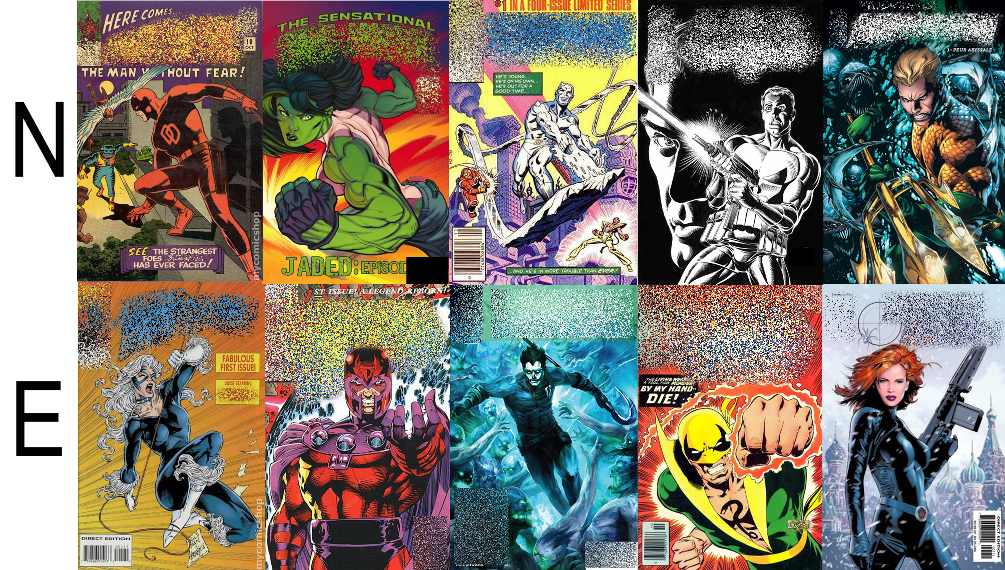 Dans chaque ligne (N et E), vous avez 5 super-héros/méchants plus ou moins connus. Dans chaque ligne se trouve un intrus.