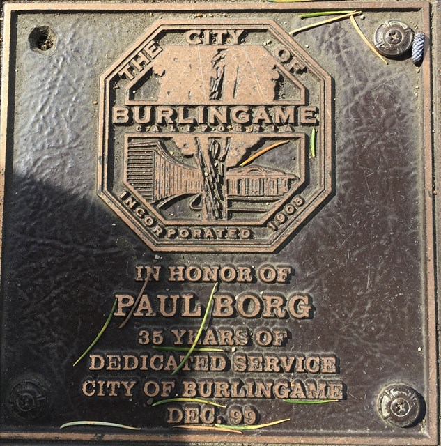 Why is there a golden hydrant? Thanks to some fine research by the Burlingame Public Library, with a hint provided by a nearby plaque, it seems that Paul Borg did the work of coloration on the hydrant as a sort of celebration for his 35 years with the city. He was a Water Department staff member at the time and retired in 1999 shortly after this work was done.