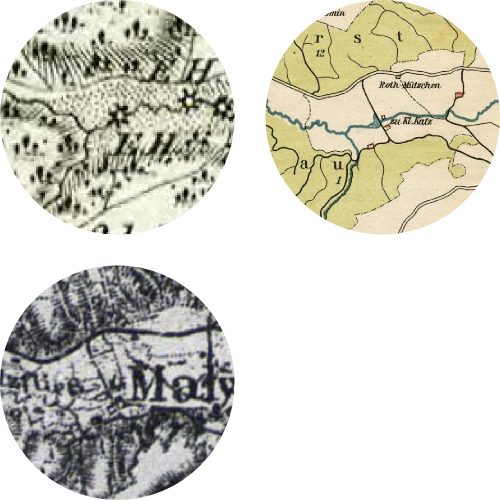 * Mills on Kacza can be found even on the oldest maps I was able to find. For maps from before 20th century, publishing date is difficult to tell and later maps often copy the cartographic content from older maps.