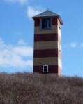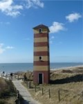 Der Leuchtturm Kaapduinen Hoog ist im oberen Bereich der Düne gebaut und _?_ m hoch. Er hat ein weißes Blinklicht, das im 5 Sekunden-Raster auf ca. 36m über dem mittleren Hochwasser