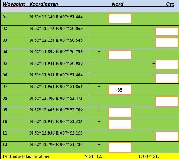 An den 12 Wegpunkten findet man jeweils eines der 12 Bilder. Durch die Übertragung der Zahlenwerte auf den Bildern in das Formular lassen sich die Finalkoordinaten berechnen.