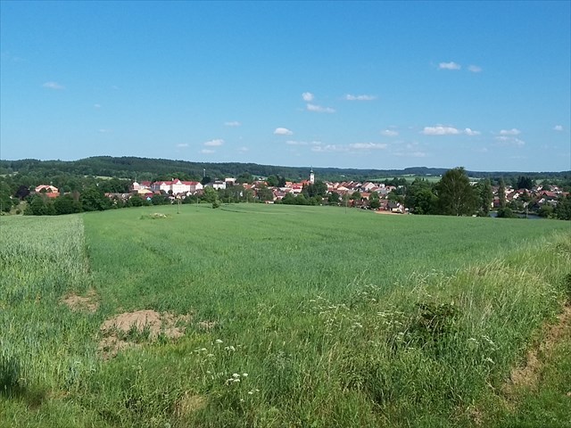 Z místa od keše se nabízí panoramatický pohled na Novou Bystřici.