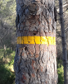 El recorrido propuesto sigue un sendero marcado con franjas de color amarillo. Cuando vayáis hacia el contenedor final podréis seguir un sendero de gran recorrido (GR) indicado con dos franjas, una roja y otra blanca.