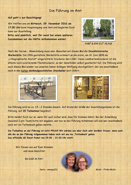 Um an der Führung teilnehmen zu können treffen wir uns schon um 17:00 Uhr beim Haupteingang vom Amt (N48° 8.499 E11° 35.418). Mehr Informationen zur Führung könnt ihr einer gesonderten Datei "Die Führung im Amt" nachlesen.
