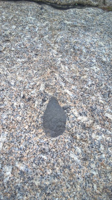 2b. o granito geralmente é formado quando uma massa de magma é injetada em uma rocha a grandes profundidades (pode ser mais de 50km). Com a pressão que ocorre nesses eventos é comum que a massa de magma arranque pedaços da rocha encaixante (que sofre a intrusão). Essa escultura tem vários desses pedaços espalhados por ela. Aonde está localizado esse fragmento em forma de gota que aparece na foto ?