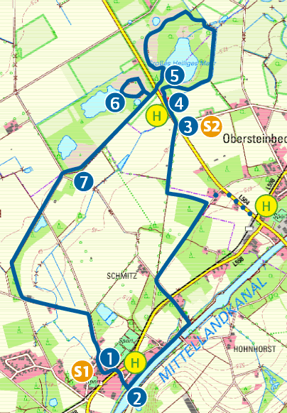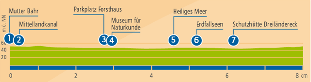 Tour durch schöne Kulturlandschaft. Attraktion: Die Erdfallseen, allen voran das Heilige Meer! In einer Tiefe von rd.100 Metern liegen Salinen, die ausgewaschen wurden und dann einbrachen. Etwa 1000 n. Chr. entstand das Heilige Meer, am 14. April 1913 der südwestlich gelegene Erdfallsee. Heute ist das Gebiet mit seinen Seen, Gräben, Mooren und Feuchtwiesen ein Paradies für Wasserfloh, Sonnentau und Libelle – und für Wanderer.