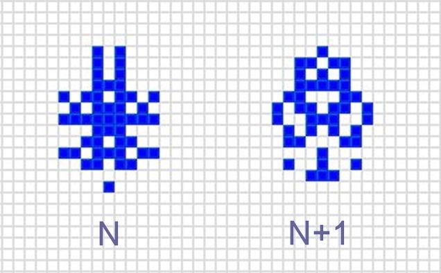 Les règles normales de Conway peuvent s'écrire comme ceci : 3/23. Les règles appliquées à l'énigme LJDLV 06 : 345/23. Utilisez le même format pour écrire les règles qui permettent de passer de la génération N à la génération N+1 dans l'image affichée, soit AAAA/BBBB. Vérifiez votre solution avec «Certitude».