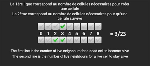 Les règles consistent à déterminer le nombre de cellules voisines (vivantes) permettant à une cellule de naître ou de rester en vie. Le tableau suivant représente les règles normales de Conway.