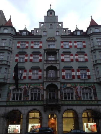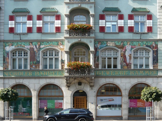 In der Zeit um 1900 war München die im deutschsprachigen Raum tonangebende Architekturmetropole, weshalb der aus Bayern stammende Architekt Ludwig Lutz den Auftrag zur Planung des repräsentativen Gebäudes für Handel und Gewerbe in Innsbruck erhielt. 1900 bis 1902 schuf er ein fünfgeschossiges, auf altdeutsche Formen zurückgreifendes Gebäude, dessen straßenseitige Front mit Erkern und Loggien unterteilt ist. Um den öffentlichen Charakter der Handelskammer zu unterstreichen, wurde die Fassade im Bereich des ersten Obergeschosses mit einem reich verzierten Mosaikband ausgestattet, das um die Fenster und eine Loggia herumgeführt wurde.
