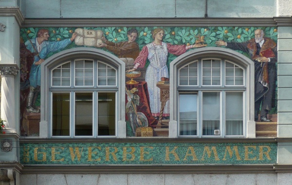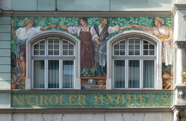 Als einen der wichtigsten Aufträge in dieser Zeit realisierte die Tiroler Glasmalereianstalt, später als Mosaikanstalt bezeichnete Werkstatt, diese Fassadendekoration in der Meinhardstraße im Zentrum von Innsbruck. Das monumentale, nach Entwürfen von Alfons Siber (Schwaz 1860-1919 Hall i. T.) gestaltete Kunstwerk trägt den Titel "Allegorie von Handel und Gewerbe" und entstand 1906.