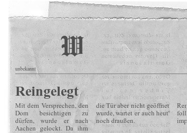 Aachen hat bekanntlich einige Sagen und Geschichten zu bieten. Manche davon kennt jedes Kind, manche sind doch eher unbekannt. Manche haben einen historischen Hintergrund und manche wiederum entbehren jedes wahren Kerns. Neuerdings ranken sich auch einige Mythen um einen geheimen Goldschatz, welcher im Aachener Wald versteckt sein soll. Um zu ihm zu gelangen, müsst ihr jedem Zeitungsausschnitt das richtige Bild zuordnen. Dabei muss man sicherlich auch mal um die Ecke denken. Wie es bei Sagen so üblich ist, können die Aussagen je nach Quelle schon einmal leicht variieren.