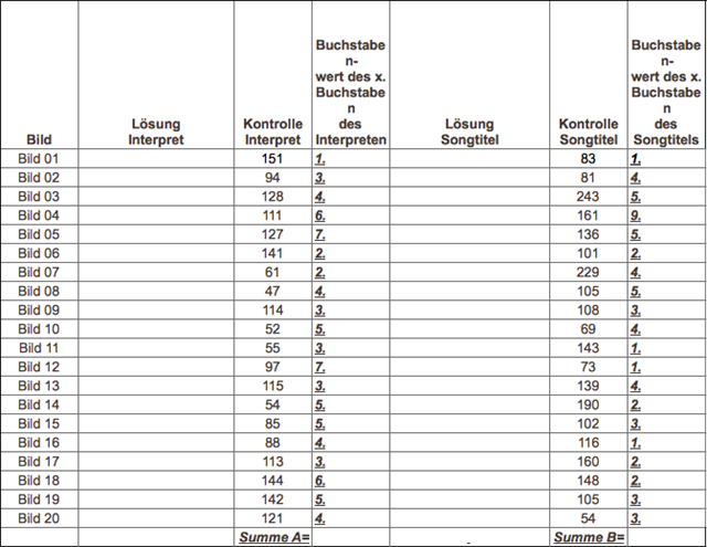 Zur eurer Kontrolle ist der Buchstabenwortwert des Songtitels bzw. des Interpreten/Band mit angegeben.