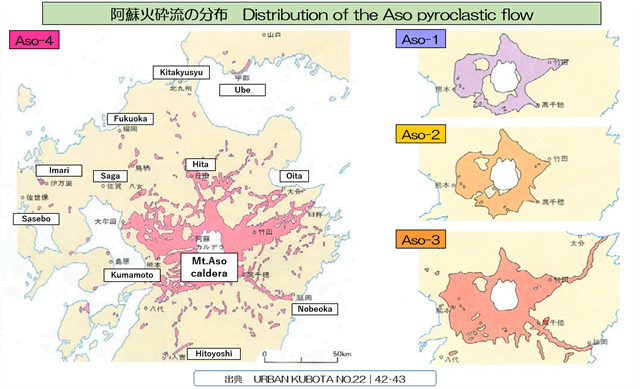 Four times of large-scale pyroclastic flow occurs in Mt. Aso during 90,000 years ago for approximately 270,000 years. A very large pyroclastic flow plateau is formed by the ejection depositing around a caldera. The sediment of four times of pyroclastic flow is called "Aso 1-4" each. It is revealed that the pyroclastic flow arrived at it widely all over Kyushu as well as Kumamoto by investigating sediment. The fourth in particular pyroclastic flow has a biggest scale and reaches approximately 120km away Ube City in Yamaguchi Prefecture.(cf. chart below)