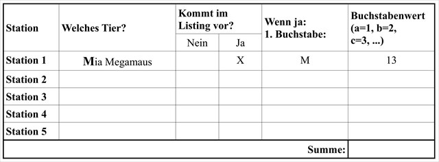 Nimm den jeweils ersten Buchstaben der Tiernamen und wandle sie in ihre Buchstabenwerte um (A=1, B=2, C=3, ...). Die Tabelle hilft dir beim Sortieren.