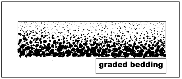 Graded bedding is a structure in which, because the larger the particle size is, the faster the particle settles out, the grain sizes of the sediment particles gradually change from the base of the bed to the top (see the figure below. Cited from the website of Washington State Colleges). By observing the direction of change of the grain sizes, you can tell which is the upper direction of the bed when it settled out in the water.
