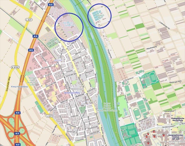 Abbildung: Standort der Kläranlagen des Abwasserzweckverbands (Quelle: OSM-Karte - Wieblingen, Handschuhsheim, Neuenheimer Feld (eigene Bearbeitung))
