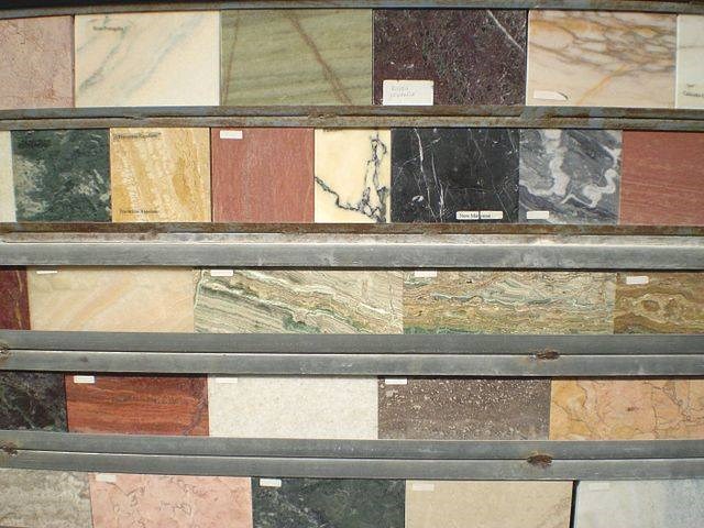 Iron oxide impurities will produce a yellow, orange, pink or red color of marble. Clay minerals can produce gray colors that often occur in bands. Bituminous materials can produce dark gray to black marble. Marble that contains serpentine often has a green color.