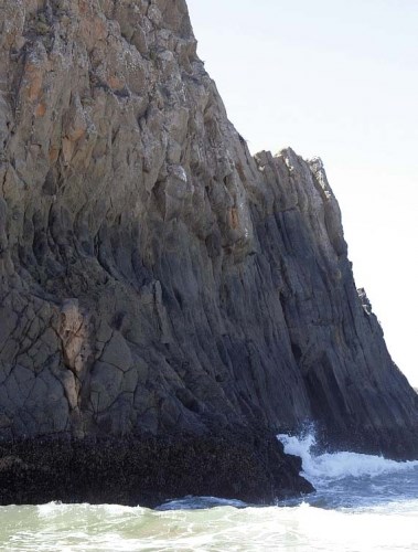 At the southern-most point of Crystal Cove you will find cliffs of andesite (a fine-grained igneous rock which cooled from lava at or near Earth’s surface). Geologists term this kind of rock volcanic as opposed to coarse-grained plutonic rock which cooled deep in Earth’s crust. Here the lava cooled quickly and produced well-defined prismatic columns. Two world famous locations visited by tourists for these columnar joints are Devils Post Pile near Mammoth Mountain, California, and the Giant’s Causeway in Northern Ireland. ![]()