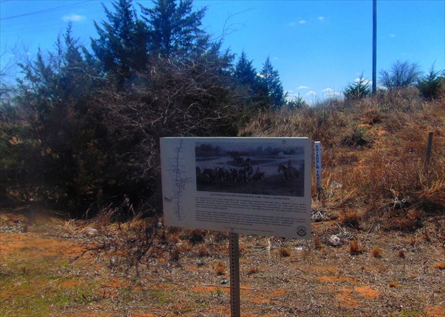 The Abilene Cattle Trail crossed the Cimarron directly before you. About a mile west, the Fort Sill - Arkansas City wagon road. The western variant of the cattle trail through Ft. Reno and the The Darlington Agency, crossed the Cimarron. A short distance north of the river, the two trails joined just before reaching the Red Fork Ranch as they continued northward.