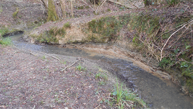 Where streams form the ground must be impermeable so that water can flow above the ground. The soil by streams in Ashplats Wood is solid, but the shape of the stream often changes due to blockages from sticks, leaves, and deposited sediment.
