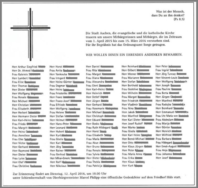 Anscheinend sind im vergangenen Jahr über hundert Personen in Aachen gestorben, um deren Bestattung sich niemand mehr hat kümmern können (oder wollen?), so dass das Ordnungsamt dafür Sorge tragen musste.