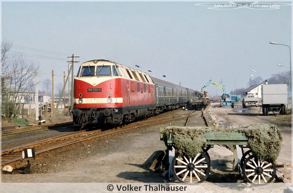118 799 am 16.03.1990 mit Eilzug von Stralsund nach Wismar im Bf Hagebök.