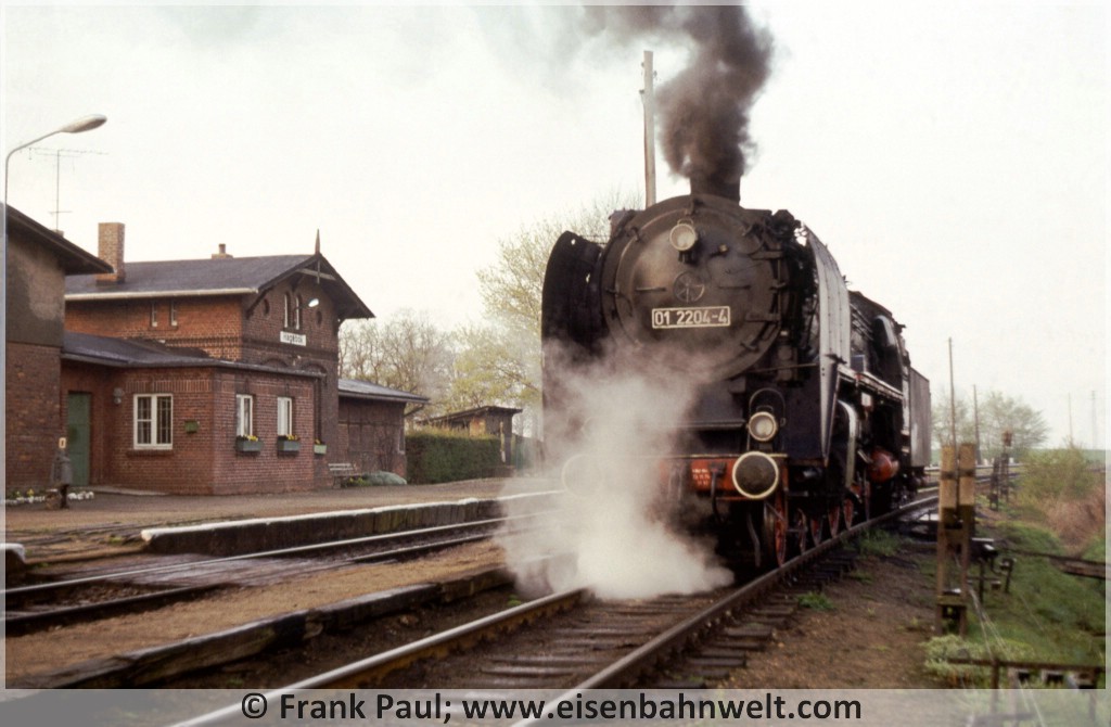 Abschiedsfahrt der 01 2204 am 08.05.1982 im Bahnhof Hagebök vor dem ehemaligen Empfangsgebäude. Der Fotopunkt ist ungefähr dort, wo die, bei Aufgabe 5 gefragte Tafel, steht.