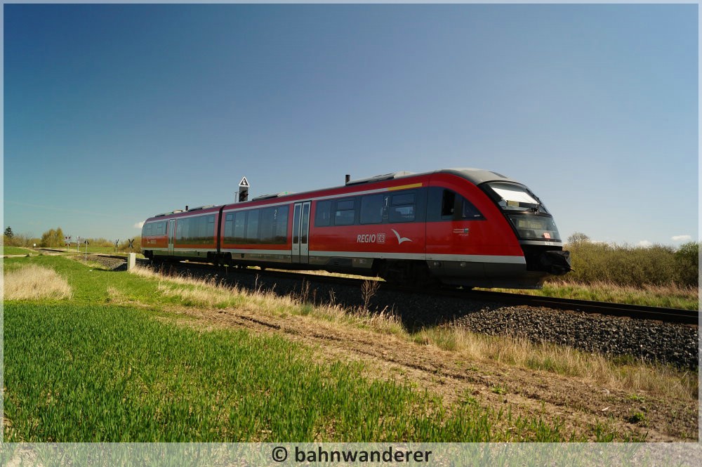Dieseltriebwagen, Baureihe 642, am Bahnübergang südlich von Hagebök.