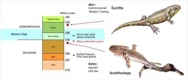 Until very recently, no one has identified a significant number of intermediate fossils, representing animals that made the transition from water to land. Theories as to why there is lack of evidence include the suggestion that oxygen levels were reduced in this period leading to a decline in the number of species. However, the TWeed Project demonstrated, by drilling a borehole in the local area, that there are layers of charcoal indicating forest fires which would only have been possible if oxygen levels were similar to today’s. A simpler explanation for Romer's Gap is that there are relatively few exposures of rocks from the period of the gap, and that those that exist have not yet been fully explored.