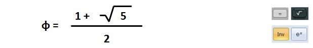 Laskimista löytyy näppäimet neliöjuurelle, π (piille) ja joskus myös e:lle. Jos ei löydy e:lle suoraan, niin sitten se löytyy ex näppäimen kautta (x=1). Φ (Fiille) ei taida löytyä? Sen arvon voi laskea kuvan mukaisesta kaavasta: