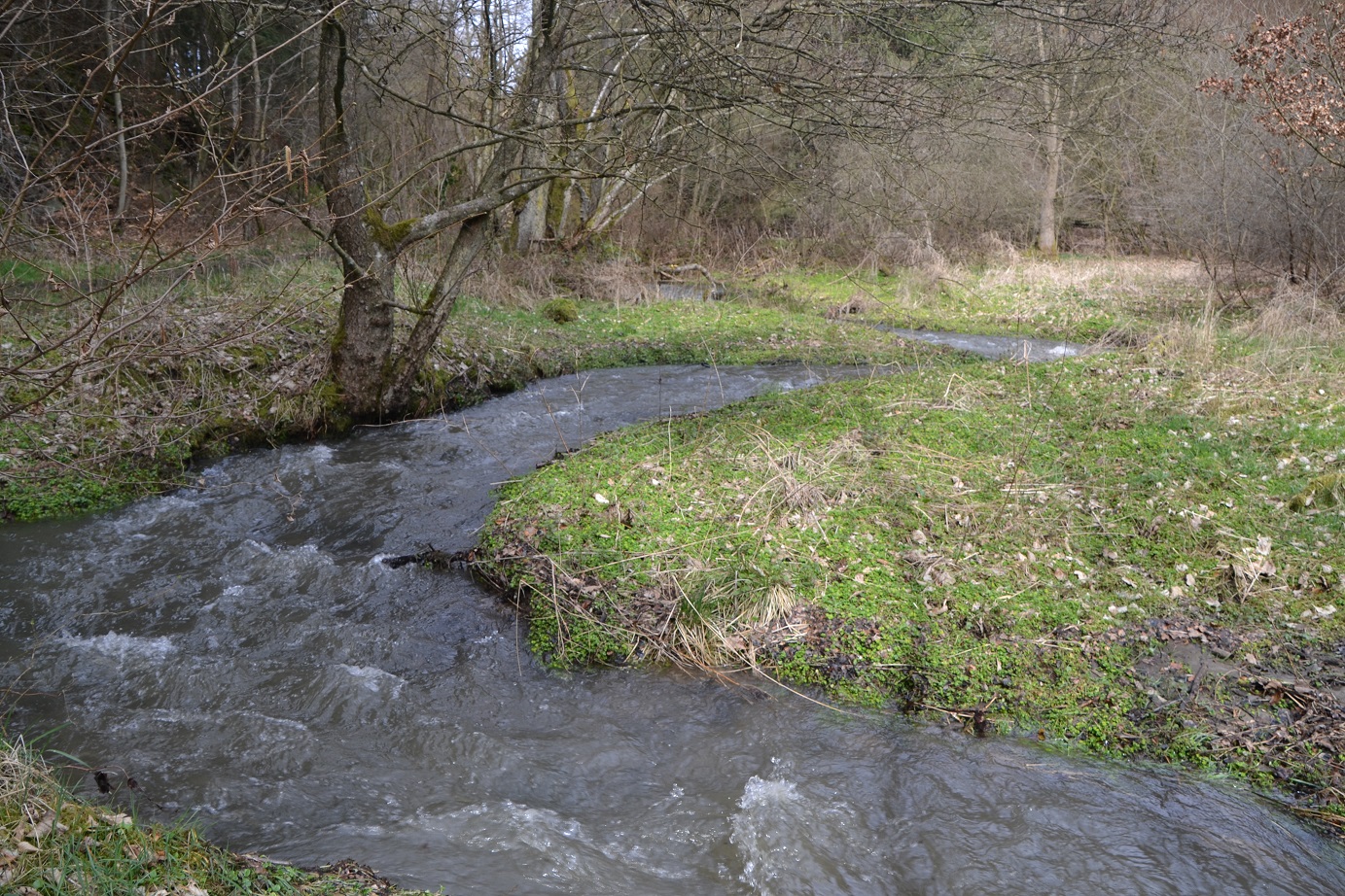 3.) Nun kommen wir zu einer praktischen Aufgabe. Um die Sinuosität zu bestimmen, benötigt Ihr eine lange Schnur, ein langes Rollmassband, oder ähnliches. Hier wo der Earthcache gelistet ist gibt es einen Durchlass für den Bach. Von hier aus geht bitte 20m den Bach hinauf und messt die genaue Uferlänge aus. Das heisst, dass ihr mit dem Bandmass die Bögen direkt am Ufer nachmesst. Das Gleiche macht Ihr dann bitte auch 20m Bach abwärts.