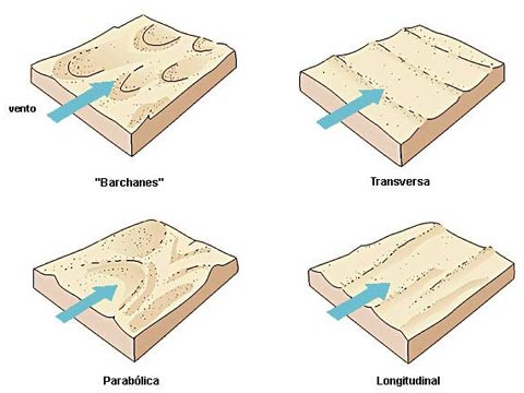 •Dunas Migratórias: também chamada de dunas móveis, esses tipos de duna mudam de local decorrente da forte ação dos ventos e ausência de vegetação ou barreira natural que a estabilizaria.