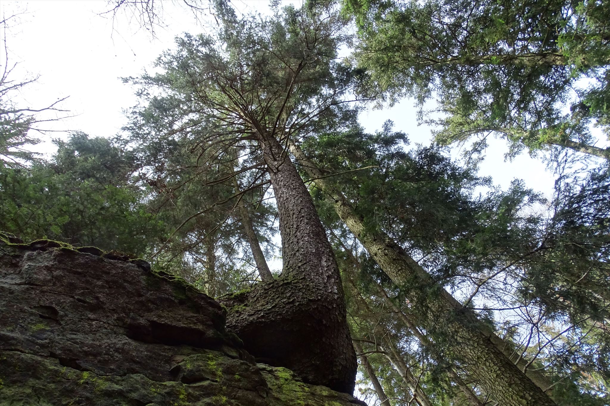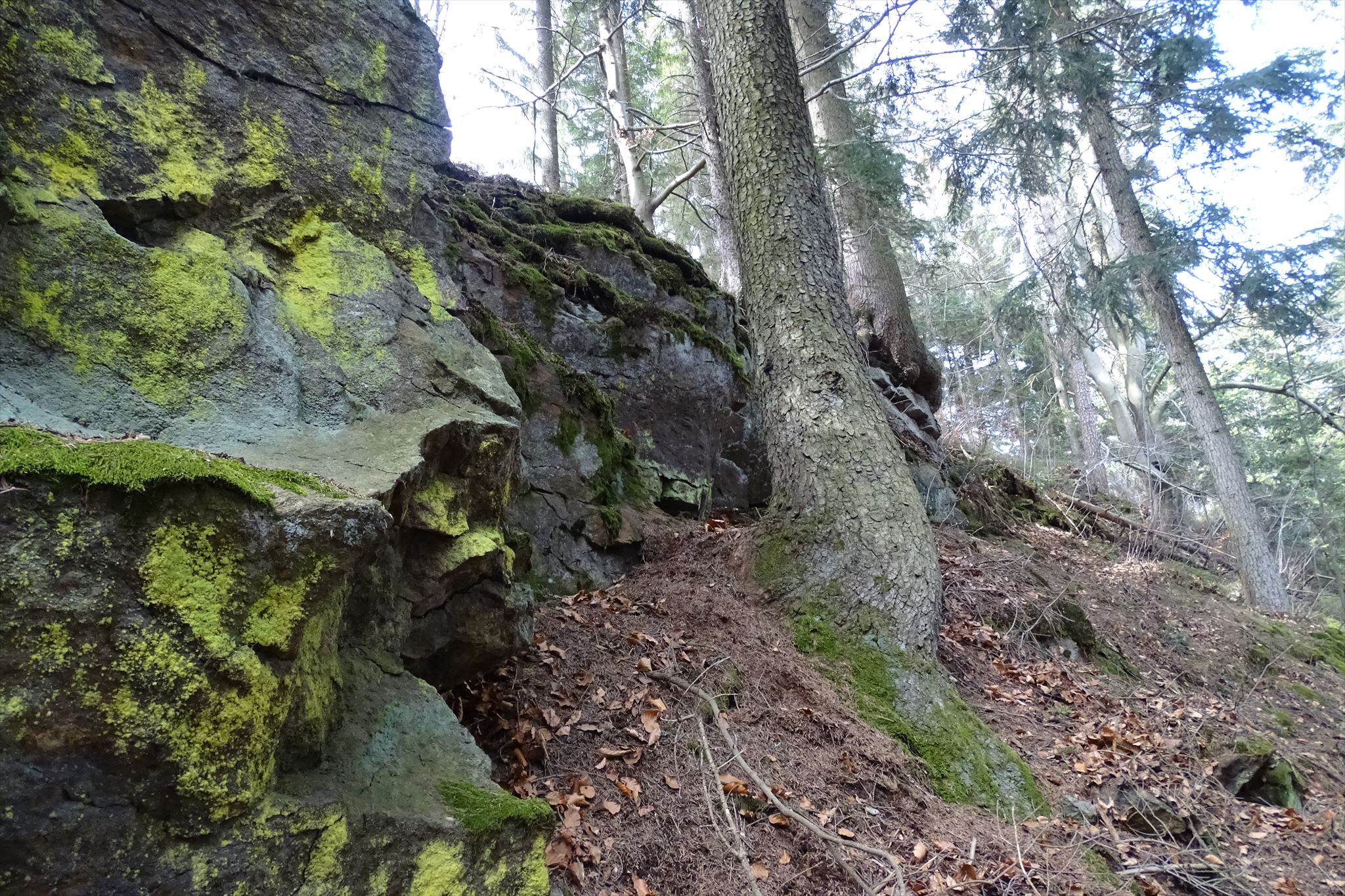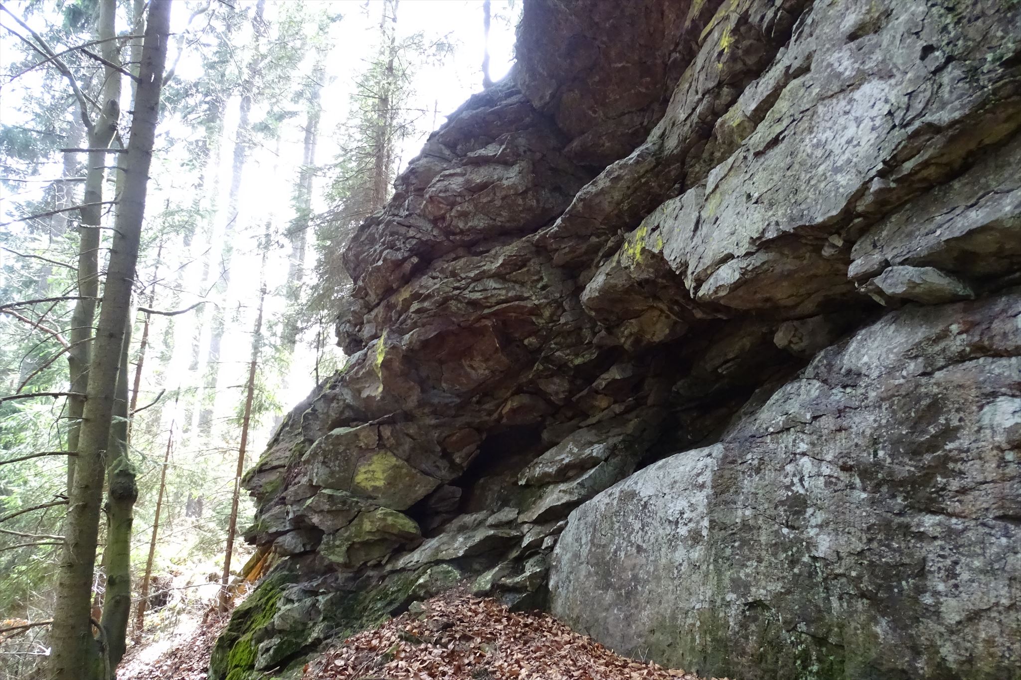 To jsme jednou takhle šli na okolní kešky, najednou se podívám doprava a říkám si, tam je nějaký velký svah, nebo snad skála. Jdeme se podívat blíž a opravdu tam skála je.