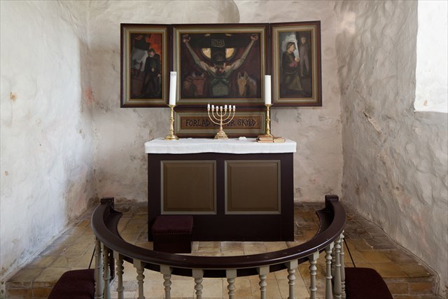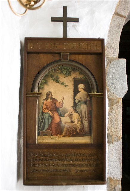 Den gamle altertavle er fra o. 1890. Motivet er Kristus med Martha og Mara, en reproduktion af A. Dorphs maleri.