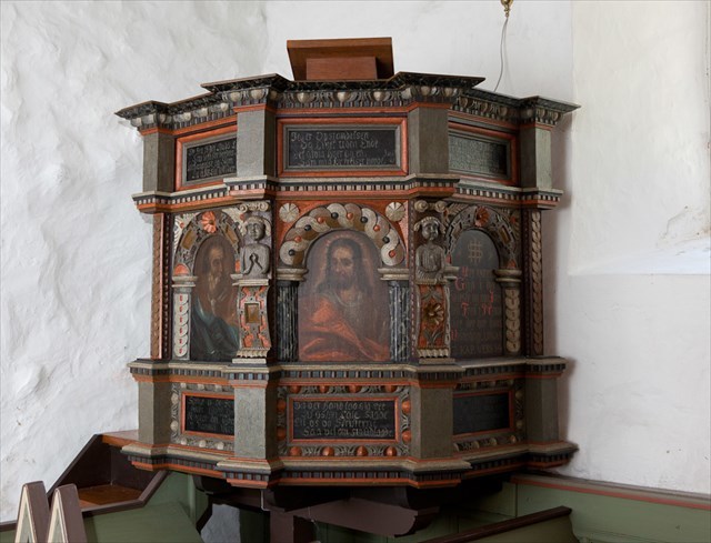 Prædikestolen er fra 1640 og formentlig lavet af Niels Snedker i Selde. Den minder om prædikestolen i Sejerslev og Jegindø. Den har kun tre fag. Bueslagene i storfelterne har kassetteværk eller slyngbånd.