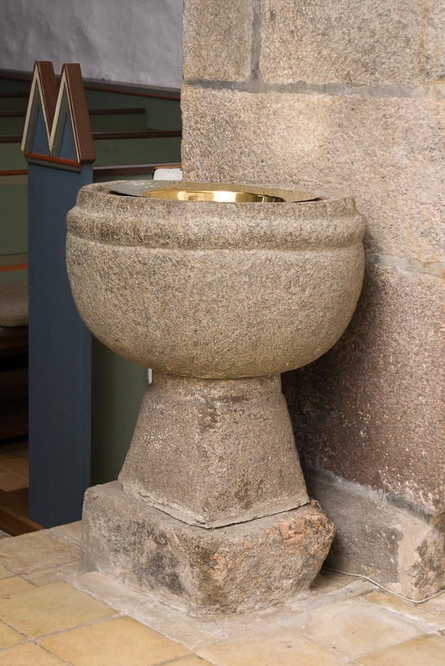 Romansk døbefont af granit. Kummen er glat og har en uregelmæssig rundstav foroven. Foden er en pyramidestub. Den er anbragt på en granitkvader.