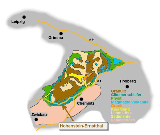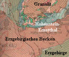 Hohenstein-Ernstthal is on the southwestern edge of a large fold structure of the variscan mountain range, the granulite mountains. The town lies on the border between the slate cladding of the high-grade metamorphic granulite and the sediments of the Erzgebirge basin, which was filled from the upper carboniferous (323-298 Mio. years ago) to the sediments of the variscan mountains (orogenic processes in the collision of Gondwana and Laurussia). Here occur several veins of gritty leadoreformation in muscovitemicaschist on.