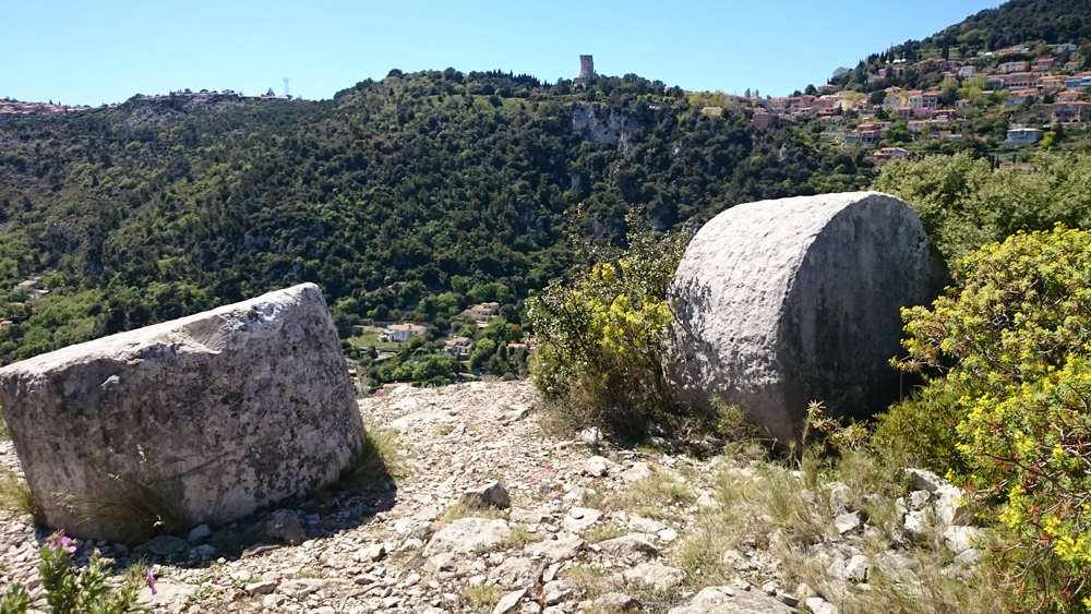 Ensuite lors de l’édification du Trophée d’Auguste, pour y façonner les éléments des colonnes. Seules les pièces sans défaut étaient utilisées, les autres abandonnées sur place. Il y a moins d’un siècle, on en dénombrait encore des dizaines, aujourd’hui, il en reste à peine trois ou quatre. Vous pourrez observer ces quelques pièces de l’époque romaine, abandonnées à cause de leurs imperfections. Le reste a disparu, réutilisé par les carrières modernes ou transformé en chaux dans le four encore visible sur le versant sud.