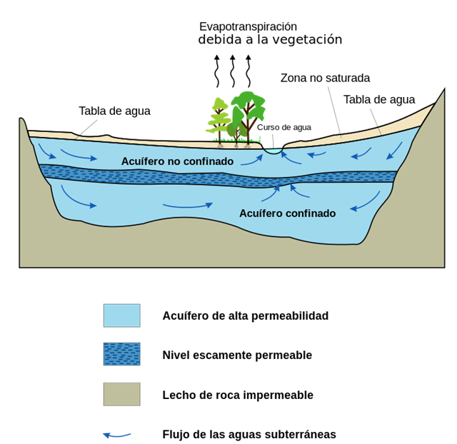 Por tanto, un acuífero es aquel estrato o formación geológica permeable que permite la circulación y el almacenamiento del agua subterránea por sus poros o grietas. Dentro de estas formaciones podemos encontrarnos con materiales muy variados como gravas de río, limo, calizas muy agrietadas, areniscas porosas poco cementadas, arenas de playa, algunas formaciones volcánicas, depósitos de dunas e incluso ciertos tipos de arcilla. El nivel superior del agua subterránea se denomina nivel freático, y en el caso de un acuífero libre, corresponde al nivel freático.
