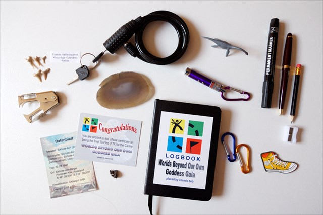 Als kleiner Anreiz enthält der Cache eine FTF-Urkunde sowie einen Meteoriten (Sikhote Alin) für den Erstfinder. Eine Coin sowie zahlreiche Tauschutensilien (siehe Foto) gehören ebenfalls zum Startinhalt. Viel Spaß bei der Suche!